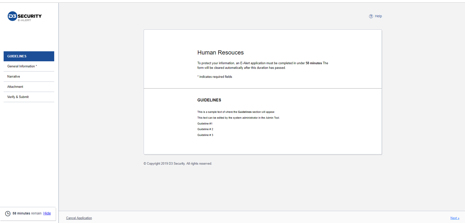 Guidelines refer to the section in the E-Alert Application that provides the user with background information and additional guidance to complete the webform.